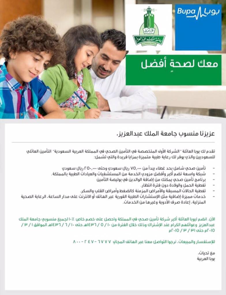 Uzivatel Kau إدارة العلاقات العامة Na Twitteru خصم خاص من بوبا لمنسوبي جامعة الملك عبدالعزيز وعوائلهم الكرام ١٠ على الباقتين الذهبية والفضية للاستفسار 8002476777 Http T Co 5bhjxxhhx0