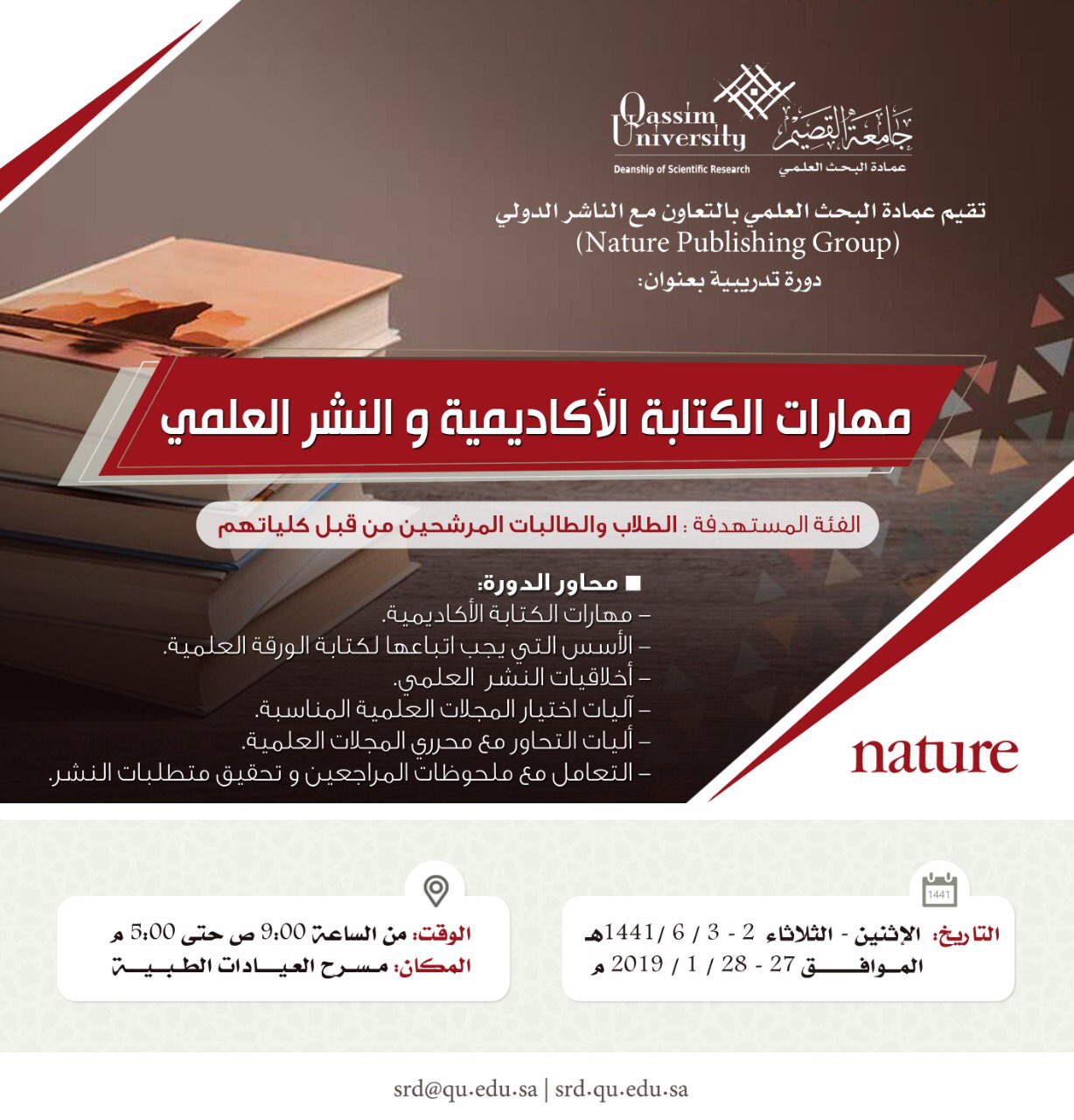 جامعة القصيم على تويتر تقيم عمادة البحث العلمي بـ جامعة القصيم دورة تدريبية بعنوان مهارات الكتابة الأكاديمية والنشر العلمي والتي تقيمها للطلاب والطالبات المرشحين من قبل كلياتهم وذلك يوم غد الإثنين وعلى مدى يومين