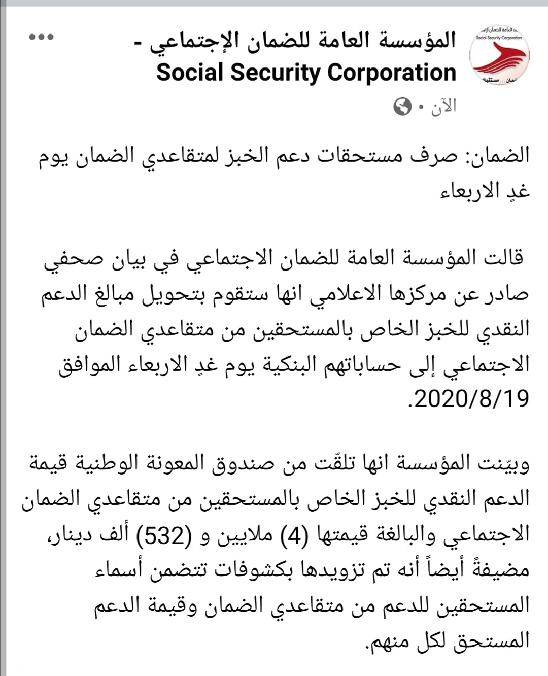 المؤسسة العامة للضمان الإجتماعي عاجل الضمان صرف مستحقات دعم الخبز لمتقاعدي الضمان يوم غد الاربعاء