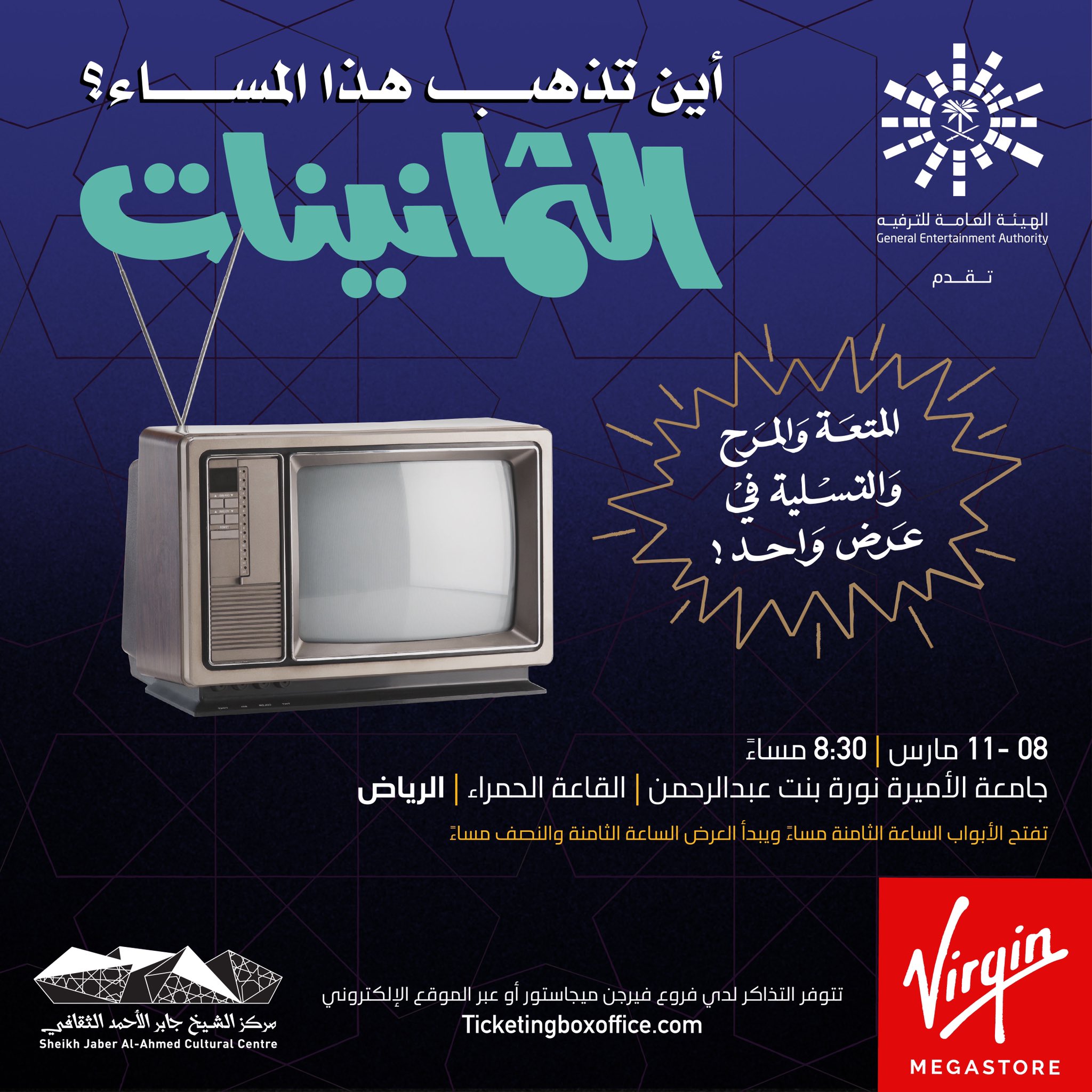 Virgin Megastore Ksa On Twitter لأول مرة في المملكة عرض أين تذهب هذا المساء الثمانينات الهيئة العامة للترفيه بتعاون مع مركز الشيخ جابر الأحمد الثقافي تقدم العرض المسرحي الذي يقام